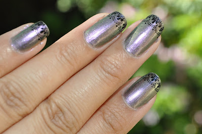 I actually did this mani last week and I'm glad I have something to show you guys because I'm still wearing my gorgeous teenage dream mani. I used OPI Not Like the Movies and stamped with Konad M57 in Konad black. When I first saw swatches of the color I wasn't too crazy about it because personally I like wearing bright colors, but after trying it out for myself, I ended up really liking it. It's a duochrome polish that appears purple, green, and silver at different angles. I tried taking a few different pics to show the different personalities of this polish.