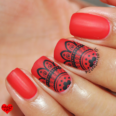 Happy Friday everyone! Today I'll be reviewing a gel matte top coat from Madam Glam. It comes in a different bottle than their regular SOG's. It's a cylindrical bottle shape and it's 10ml instead of the usual 15ml. Here I used Madam Glam gel Cherry Party and stamped using MoYou London Mandala 02 in Mundo de Unas Black.