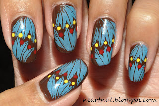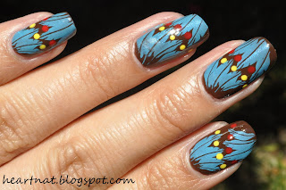 Can you believe it, this is my one and only brown nail polish! I just got it last week in my haul and really wanted to try it. I like it a lot! This is 3 coats of O.P.I. Suzi Loves Cowboys from their Texas Collection. It looks like I melted down a chocolate bar and painted my nails with it, yum! I wanted to use a bright color to stamp on this one and I had the perfect idea-- a Pocahontas/Native American inspired theme. I stamped using BM 214 in Konad Sky Pearl. Then I added dots using China Glaze Happy Go Lucky and China Glaze Hey Sailor. The stamping isn't done as well as my other manis, but it's a little harder with less intricate designs. I kept scraping more polish off than I wanted to. I still totally love the way this looks though!