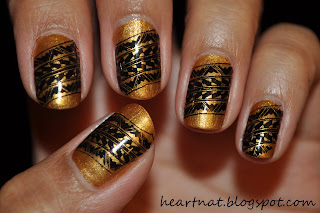 I did this mani about 3 weeks ago. I was just too busy to post it before I left to my trip. I really like the design, it looks tribal to me. I didn't think it would cover my full nail so I decided to stamp it diagonally across my nails. For a base I used O.P.I. Bling Dynasty from the Hong Kong Collection. I love this color. It applied soo nicely and dried quickly. I only used 2 coats. There's a lot of fine glitter in this polish so it's really pretty and sparkly and super easy to remove. I used BM 221 in Konad black.